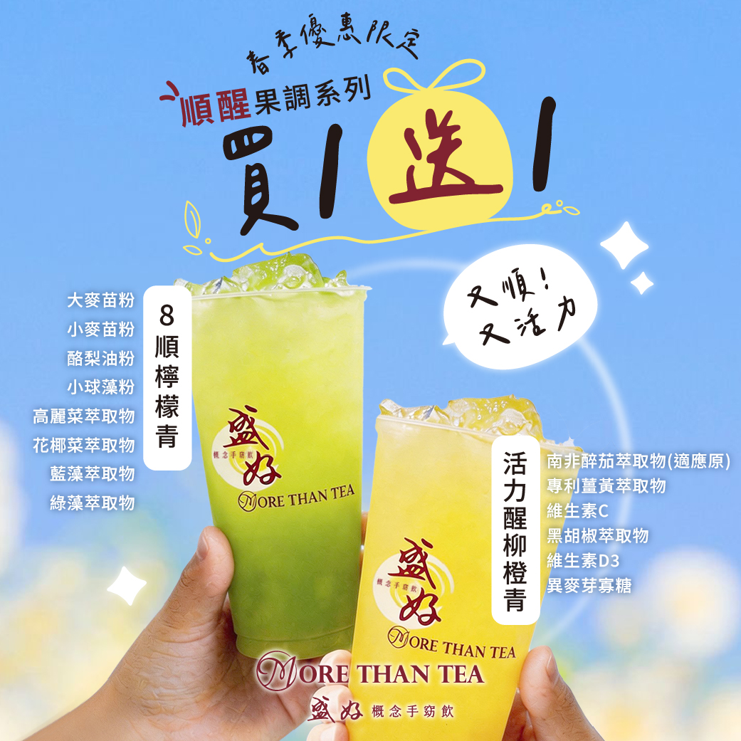 為了迎接美好的春季,盛好 MORE THAN TEA 特別推出為期一個月的超人氣果調飲品限時優惠。 無論是需要提神開機,還是想輕鬆補足膳食纖維,這次絕對不能錯過! 【活動時間】2026/3/23 (一) - 4/23 (四) 【活動品項】活力醒柳橙青跟8順檸檬青 【活動詳情與規範】 優惠內容:指定品項(8順檸檬青、活力醒柳橙青)買一送一。 領取方式:僅限 門市現場領取,不適用於電話預訂、線上訂購及外送平台。 *本活動不得與其他優惠活動併用*