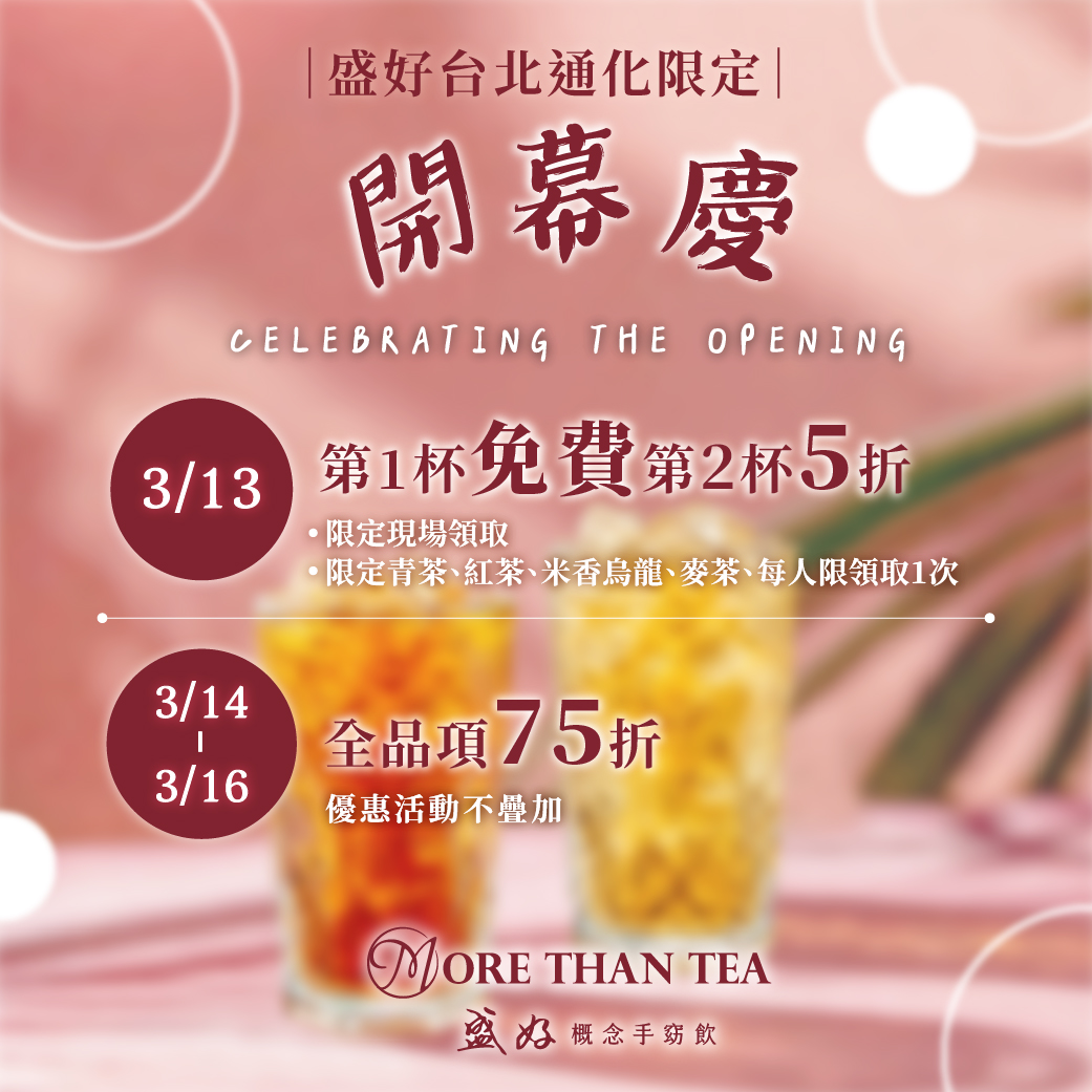 ✨ 3/13 (五) 開幕限定:首日好禮雙重送 第一杯免費: 現場排隊前進,第一杯由我們請客!(每人限領一杯) 第二杯 5 折: 好事成雙,第二杯半價優惠。(每人限購 5 杯) ※ 指定單茶品項:紅茶 / 烏龍 / 青茶 / 麥茶 ✨ 3/14 – 3/16:全品項分享慶 全品項 75 折: 連續三天,全店飲品不限品項,通通 75 折!